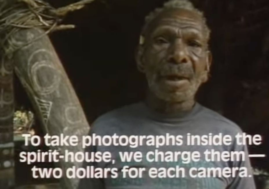 Cette mélancolie d’un éden colonial qui pourrait apparaître ambiguë pour un esprit premier degré est ridiculisée et retournée contre elle-même par les interviews des papous qui ne sont pas dupes de leur nouveau statut économique de subordonnés apporté par l’économie du tourisme. Autrefois désirés pour leur force de travail comme à l’époque ancienne montrée par les photographies d’archives où ils sont entourés de colons ou d’officiers militaires, ils sont cette fois valorisés par l’exotisme qu’ils renvoient aux touristes. Cet exotisme se mesure alors par une valeur monétaire. Les touristes doivent payer deux dollars pour rentrer dans la maison sacrée des esprits et prendre des photos.